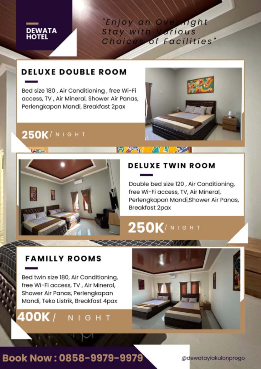 Dengan lokasi strategis, fasilitas lengkap, dan pelayanan yang ramah, Hotel Dewata Kulonprogo adalah pilihan sempurna untuk menginap saat berkunjung ke Yogyakarta. Rasakan kenyamanan dan kepuasan selama Anda berada di sini.